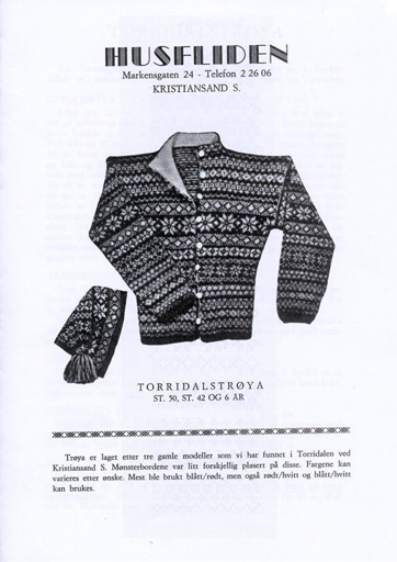 Trøya var strikket i tre boler, med søm midt foran og i sidene. Senere ble svært like trøyer kalt Torridalskofta, i hvitt og grått. Husk at mange trøyer ble strikket rundt og klippet – sømmene lurer mange til å tro at alt er strikket flatt.